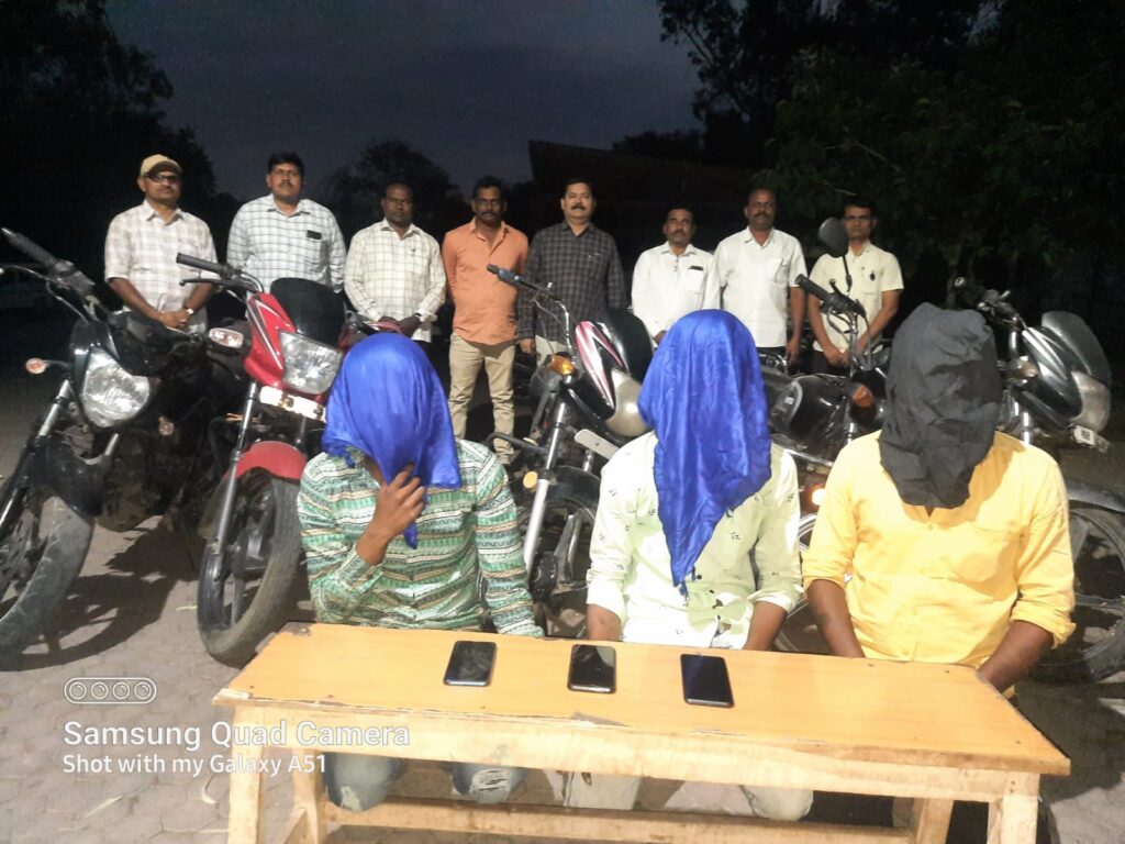 यांना अतिशय शिताफीने तात्काळ ताब्यात घेऊन त्यांनी लातूर शहरातील विविध पोलीस स्टेशनच्या हद्दीत चोरी केलेल्या मोटारसायकल बाबत विचारपूस करून पोलीस ताब्यातील तिन आरोपीकडून चोरीच्या पाच मोटारसायकली, चोरीचे तीन मोबाईल असा एकूण 02 लाख 72 हजार रुपयाचा मुद्देमाल हस्तगत करण्यात आला असून मोटार सायकल चोरी चे तीन गुन्हे उघडकीस आलेले आहेत.सदरची कामगिरी वरिष्ठांचे मार्गदर्शनात स्थानिक गुन्हे शाखेचे पोलीस निरीक्षक श्री.गजानन भातलवंडे यांचे मार्गदर्शनात सहाय्यक फौजदार संजय भोसले, पोलीस अंमलदार राम गवारे, कोळसुरे, सिद्धेश्वर जाधव , नाना भोंग , चालक केंद्रे यांनी पार पाडली.