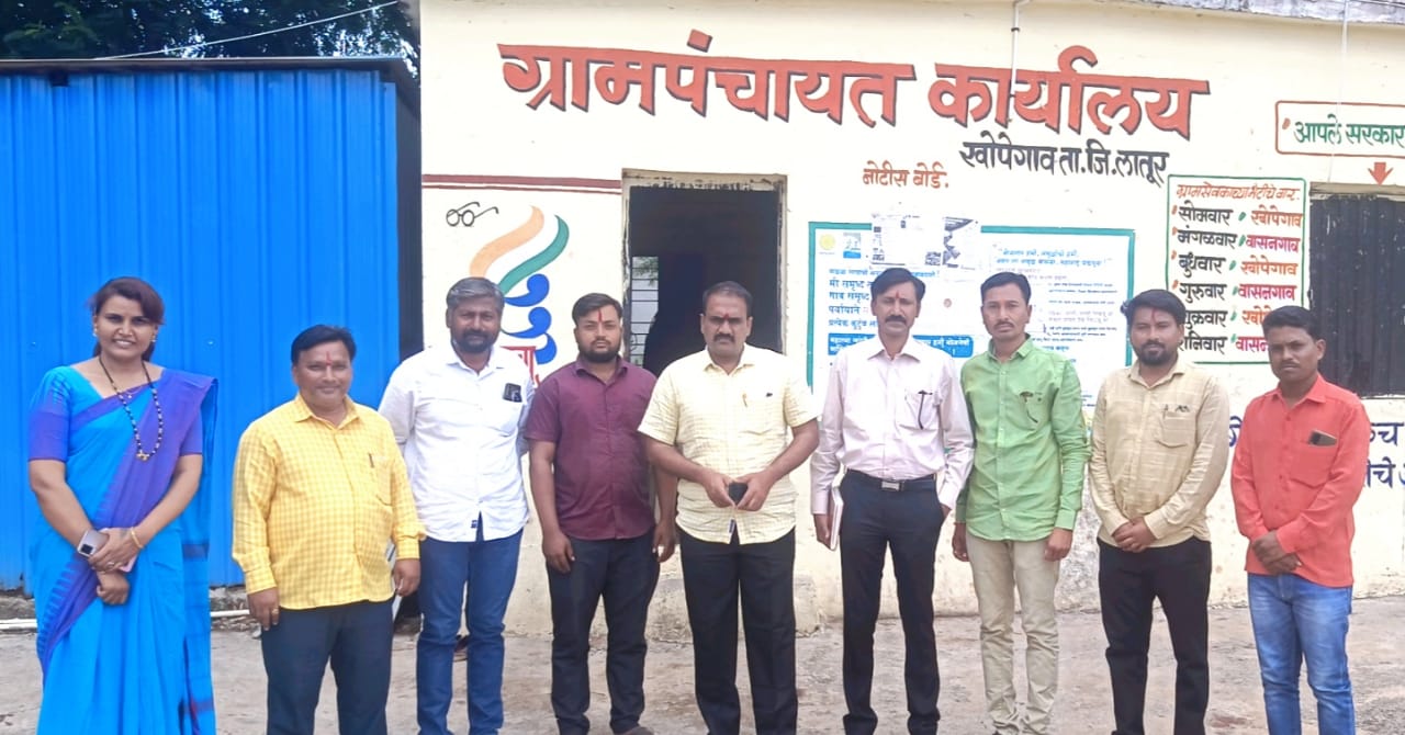 लातूर ( प्रतिनिधि ) आज दि-24-06-2022 रोजी लातूर पंचायत समिती येथे नवीन नियुक्त झालेले गट विकास अधिकारी मा. तुकाराम जी भालके यांनी लातूर तालुक्यात सर्वात प्रथम मौजे खोपेगाव गावाला भेट दिली यावेळी ग्रामपंचायत च्या वतीने त्यांचा खोपेगावचे प्रथम नागरिक सरपंच श्रीमती तेजाबाई मोरे यांच्या हस्ते शाल श्रीफळ देऊन सत्कार करण्यात आला तसेच ग्रामपंचायतीचे उपसरपंच अतुल पवार , रवी मोरे , कर्मचार्यांच्या वतीने ग्राम रोजगार सेवक अमोल घायाळ तसेच गावातील अनेक गावकऱ्यांनी त्यांचा पुष्पगुच्छ देऊन सत्कार केला.