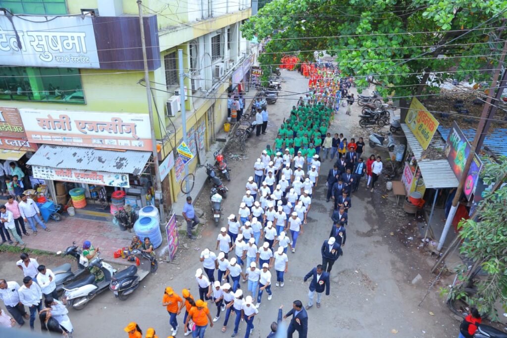 लातूर ( प्रतिनिधी) देशिकेंद्र विद्यालयात स्वातंत्र्याच्या अमृत महोत्सवी वर्षानिमित्त विविध उपक्रम घेतले जात आहेत.या उपक्रमाचा भाग म्हणून शनिवार(दि.१३)रोजी साडेनऊच्या सुमारास जनजागृती फेरी काढण्यात आली.या फेरीत विद्यार्थ्यांनी देशातील विविध राज्यातील लोकांच्या वेशभूषा साकारून एकात्मतेचा संदेश दिला. शिवाय, चित्ररथावर आरुढ झालेल्या विद्यार्थ्यांनी क्रांतिकारक तसेच स्वातंत्र्य लढ्यातील अनेक सेनानींच्या व्यक्तीरेखा साकारुन त्यांच्या कार्याला उजाळा दिला. यावेळी विद्यार्थ्यांच्या हातात तिरंगी झेंडे तर तोंडी देशभक्तीपर घोषणा होत्या. या घोषणांनी परिसर निनादून गेला होता.