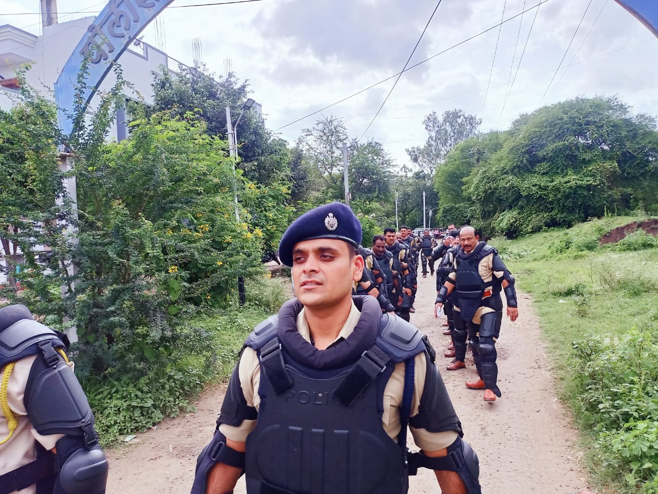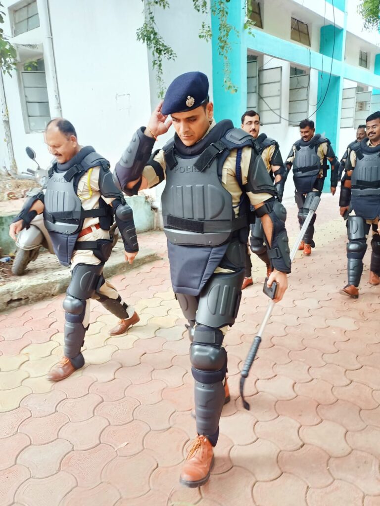 सदरचे फुल बॉडी प्रोटेक्टर घालून जिल्ह्यातील सर्वच ठाणे प्रभारी अधिकारी व अंमलदार यांनी रूट मार्च केला आहे .