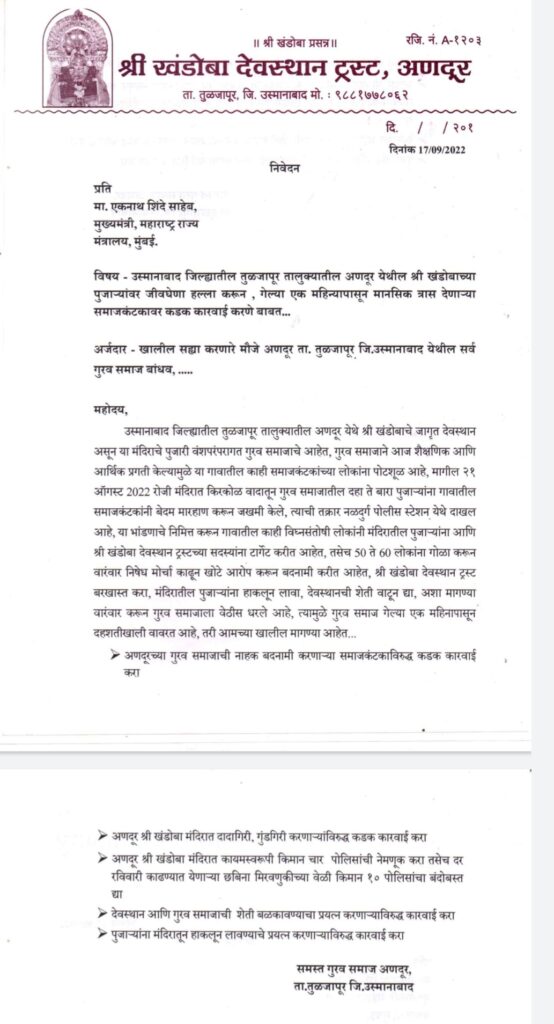 या निवेदनात म्हटले आहे की, तुळजापूर तालुक्यातील अणदूर येथे श्री खंडोबाचे जागृत देवस्थान असून या मंदिराचे पुजारी वंशपरंपरागत गुरव समाजाचे आहेत, गुरव समाजाने आज शैक्षणिक आणि आर्थिक प्रगती केल्यामुळे या गावातील काही समाजकंटकांना पोटशूळ उठले आहे, मागील २१ ऑगस्ट 2022 रोजी मंदिरात किरकोळ वादातून गुरव समाजातील दहा ते बारा पुजाऱ्यांना गावातील समाजकंटकांनी बेदम मारहाण करून जखमी केले, त्याची तक्रार नळदुर्ग पोलीस स्टेशन येथे दाखल आहे,