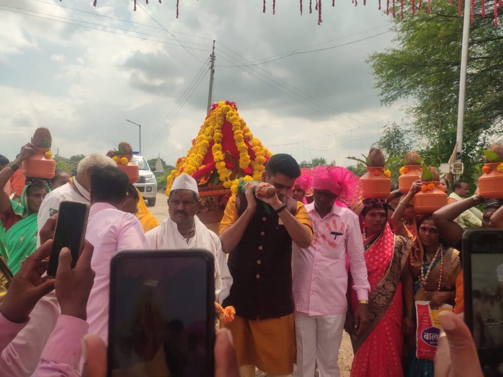 चंद्रकांत साळुंके यांच्या घरून निघणाऱ्या पालकी (छबिना) मिरवणुकीचा शुभारंभ खासदार सुधाकरराव शृंगारे यांच्या हस्ते करण्यात आला. यावेळी माजी आमदार बब्रुवान खंदाडे, भाजपाचे जिल्हा उपाध्यक्ष बालाजी पाटील चाकूरकर, अहमदपूर कृषी उत्पन्न बाजार समितीचे माजी सभापती दिलीपराव देशमुख, भाजपाचे तालुकाध्यक्ष शिवाजीराव बैनगिरे, जिल्हा परिषदेचे माजी समाजकल्याण सभापती रोहिदास वाघमारे, पंचायत समितीचे माजी सभापती व्यंकटराव सोनवणे आदी मान्यवरांची प्रमुख उपस्थिती होती तर जनमाता देवीच्या मंदिरातील घटस्थापना आमदार बाबासाहेब पाटील, जेष्ठ नागरिक बन्सीलाल कदम, सहाय्यक पोलीस अधीक्षक निकेतन कदम, पोलीस निरीक्षक बालाजीराव मोहिते, पोलीस उपनिरीक्षक तुकाराम फड, पोलीस उपनिरीक्षक कैलास पाटील, अनिल वाडकर आदींच्या प्रमुख उपस्थितीत गावकऱ्यांच्या व मानकऱ्यांच्या हस्ते करण्यात आली.