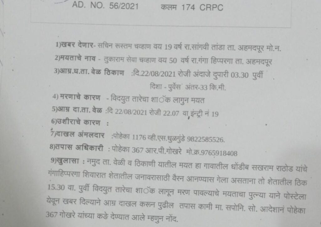 पोलिसांनी सांगितले अहमदपूर तालुक्यातील सांगवी तांडा शिवारातील उभ्या पिकाचे रानडुक्कर मोठ्या प्रमाणावर नुकसान करत आहेत.त्याचा करण्यासाठी ऊसाच्या शेतीत तारेची व्यवस्था करण्यात आली होती.दरम्यान त्या तारेमध्ये विजप्रवास सोडण्यात आला होता.रविवारी सकाळी 7 वाजण्याच्या सुमारास धोंडीराम राठोड यांच्या शेतात घरातील पशूधनासाठी वैरण आणण्यासाठी तुकाराम शिवाजी चव्हाण वय वर्षे (50) गेले होते.त्यावेळी त्यांना विद्युत प्रवाह सुरू असलेल्या तारेचा स्पर्श झाला.यामध्ये बसलेल्या वीजेच्या धक्क्याने त्यांचा मृत्यू झाला.