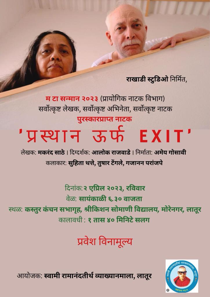 म टा सन्मान २०२३ ( प्रायोगिक नाटक विभाग ) मध्ये सर्वोत्कृष्ट लेखक, सर्वोत्कृष्ट अभिनेता व सर्वोत्कृष्ट नाटक असे विविध पुरस्कार मिळविलेल्या या नाटकात ज्येष्ठ अभिनेत्री सुहिता थत्ते, तुषार टेंगले , गजानन परांजपे यांच्या प्रमुख भूमिका आहेत. या नाटकाचे लेखक मकरंद साठे हे असून निर्माता अमेय गोसावी हे तर दिग्दर्शक आलोक राजवाडे हे आहेत. रविवारी सायंकाळी श्रीकिशन सोमाणी विद्यालयाच्या कस्तुर कंचन सभागृहात होणारा हा नाट्य प्रयोग विनामूल्य ठेवण्यात आला असून प्रवेशिका रियल हनी शॉप, ठाकरे चौक, लातूर व हरिती बुक गॅलरी, गाळा क्रं . १०१, दुसरा मजला आदर्श कॉलनी कॉम्प्लेक्स, औसा रोड लातूर याठिकाणी उपलब्ध आहेत. या नाटकास लातूरच्या नाट्य रसिकांनी आवर्जून उपस्थित राहून लाभ घ्यावा,असे आवाहन स्वामी रामानंदतीर्थ व्याख्यानमालेच्या वतीने श्रीनिवास लाहोटी, अतुल देऊळगावकर, सुमती जगताप , डॉ.अजित जगताप यांनी केले आहे.