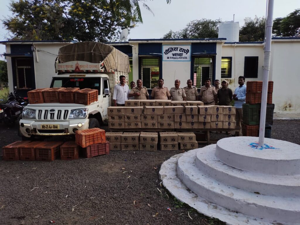 भादा :-{ दिपक पाटील }आठवडय़ात अवैध धंद्यावर कारवाई चा पाऊस, आज रोजी भादा पोलीस स्टेशन हद्दीत,औसा ते तुळजापूर जाणारे हायवे रोडवरून महिंद्रा पीकअप क्र. एम.एच २५ एजे ०८४४ हा भाजीपाल्याची रिकामे कॅरेट व त्या कॅरेटचे खाली विदेशी दारू बॉक्स घेऊन जात असले बाबतची गुप्त माहिती मिळाल्यावर सदर पिकअप सापळा लावून तुळजापूर रोडवर चिंचोली(काजळी)पाटी येथून ताब्यात घेतला असून त्यामध्ये खालील विदेशी मद्य मिळून आले.
