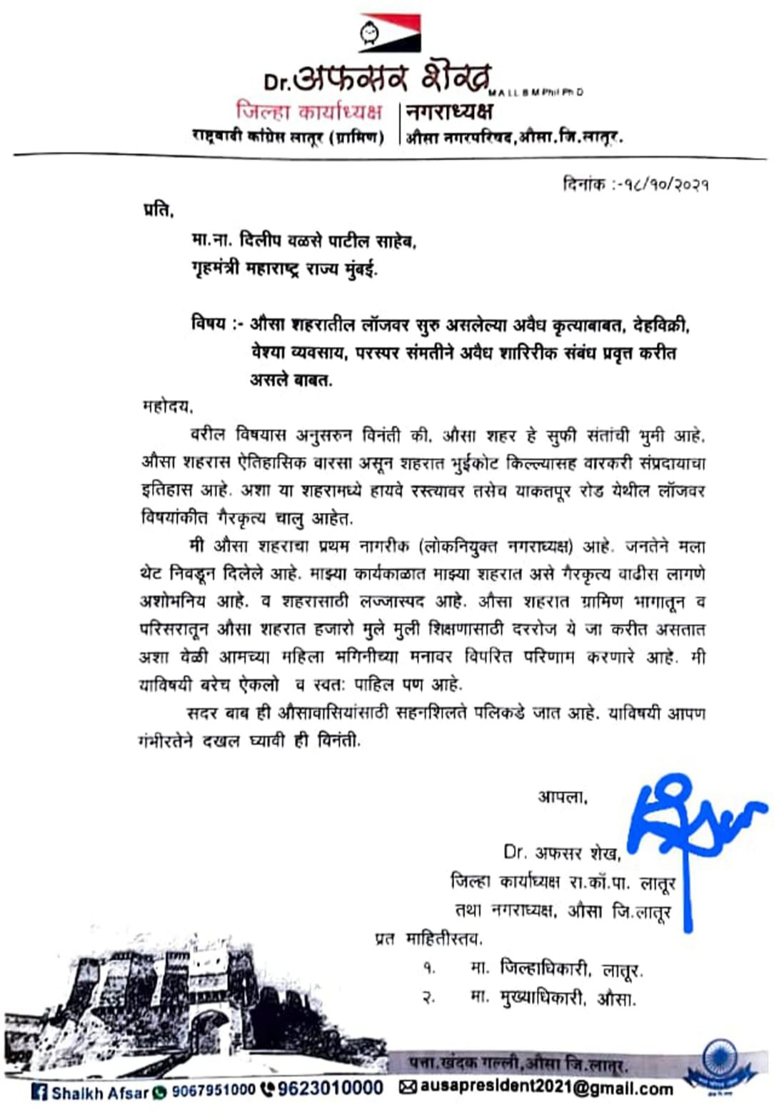 लातूर : { दिपक पाटील } बोटावर मोजण्या इतक्याच महिलेच्या घरात किंवा भाडेतत्त्वावर घेतलेल्या घरात किंवा लाॅज वर अनेक ठिकाणी वेश्या व्यवसाय चालतो. गेल्या महिन्यात लोदगा रोडवर एका पञ्याच्या शेडवर चालत असलेल्या वेश्याव्यवसाया वर औसा पोलिसांनी धाड टाकून तीन महिलांची सुटका केली होती , लातूर शहरातील अनेक ठिकाणी हा धंदा तेजीत आहे ,अनैतिक मानवी वाहतूक प्रतिबंध कक्षाने बनावट ग्राहक पाठवून वेश्या व्यवसाय सुरू असल्याची खात्री करायला पाहीजेत. या प्रकरणात आता औसा येथील नगराध्यक्ष अफसर शेख यांनी ग्रहमंञी दिलीप वळसे पाटलांना पञ देत साकडे घातले आहे, कारण लातूर ची जशी परिस्थीती आहे तसेच औसा येथील आहे, येथील लाॅज वर वेश्याव्यवसाय चालतो असे नगराध्यक्ष सांगतात, पोलीस अधीक्षक निखिल पिंगळे यांची अवैध धंद्यावर आपला धाक जमवला आहे व अवैध धंद्येवाल्याला सळो की पळो करून सोडले आहे, पण त्यांचे इकडे पण लक्ष देण्याची गरज आहे ,अडचणीतील महिलांना पैशाचे आमिष दाखवून हे लोक महिलांना वेश्या व्यवसाय करण्यास भाग पाडतात, शारीरिक पिळवणूक करून त्यांच्या कमाईवर स्वत:ची उपजीविका करीत असल्याचे काही सुजाण नागरिक सांगत आहेत . सभ्य लोकांच्या वसाहतीत कुंटणखाना सुरू असल्याचे चित्र सद्यःस्थितीत पहावयास मिळत आहेत , त्यातील एका महिलेने नाव न सांगण्याच्या अटीवरुन वेश्याव्यवसाय ठिकाण ची माहिती सांगितली आहेत . १} वैभव नगर २} चौधरी नगर,३} प्रकाश नगर ४}एमआयटी महाविद्यालय पाठीमागील बाजूस ५} म्हाडा काॅलनी ६}अवंती नगर ७} काॅक्सीट महाविद्यालय पाठीमागील बाजूस ८} कळंब रोड ९} पाखरसांगवी रोड १० } नंदी स्टॉप ११} जुना औसा रोड, या परिसरातील नागरिकांमधून आश्चर्य व्यक्त केले जात आहे. अडचणींमुळे वाढतोय वेश्या व्यवसाय मार्च २०२० पासून कोरोनाचे संकट पूर्णपणे हद्दपार झालेले नाही. पहिल्या व दुसऱ्या लाटेत कडक निर्बंध लागू केल्याने अनेकांसमोरील विशेषत: हातावरील पोट असलेल्यांच्या अडचणी वाढल्या. अनेकांचे व्यवसाय बंद पडले तर अनेकांचा रोजगार गेला. या पार्श्वभूमीवर पैसे मिळविण्यासाठी वेश्या व्यवसाय वाढू लागल्याचे सूत्रांनी सांगितले. #DSPNEWS